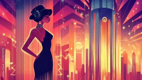 woman, elegant, city, fireworks, spectacle, night, city landscape, dress, hat, jewellery, glamour, sophisticated, stylish, modern, retro, futuristic, vibrant, colourful, bright, dazzling, sparkling, shining, gold, orange, red, purple, pink, building, skyscraper, tower, light, illumination, background, scene, illustration, artwork, graphic, design, style, fashion, beauty