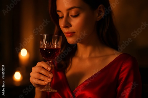 Elegant woman holding a crystal glass, deeply smelling red wine. Enjoying a relaxing, romantic evening moment