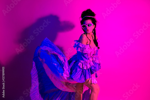 Elegant woman in historic styled dress posing in vibrant ultraviolet lighting