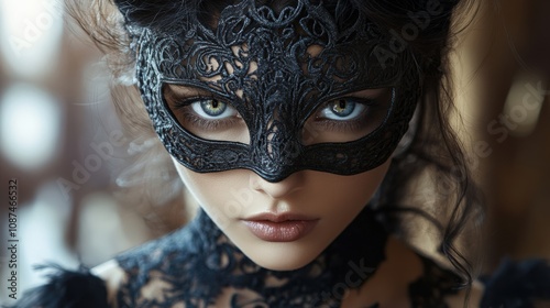 Elegant Woman in Intricate Black Lace Mask Portrait
