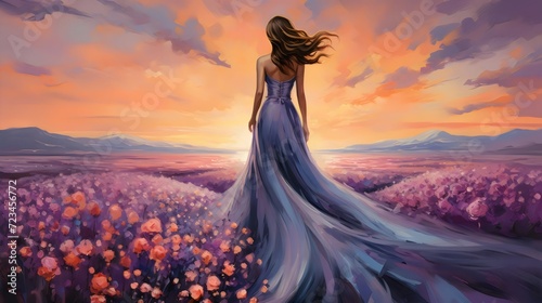 woman, sunset, flower field, vibrant, elegant, dress, purple, orange sky, cloud, nature, landscape, tranquil, serene, dusk, evening, silhouette, mountain, horizon, beauty, scenic, contemplation, solitude, peaceful, twilight, gown, backview, artistic, digital artwork, colourful, flora, blossom, blooming, romantic, fantasy, idylli