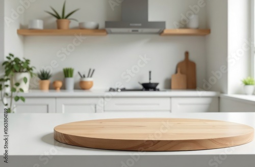 Elegant wooden board on a minimalist kitchen counter with soft lighting