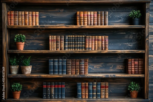 Elegant wooden bookshelf displaying classic literature cozy home library high fidelity decor warm atmosphere close-up view