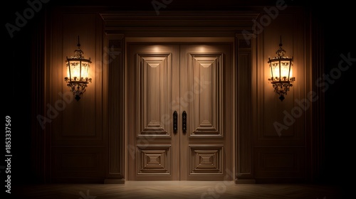 Elegant Wooden Double Doors Illuminated by Warm Lantern Light.