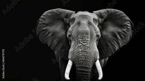 Elephant head close-up, monochrome, intricate details, black background, bold and dramatic contrast
