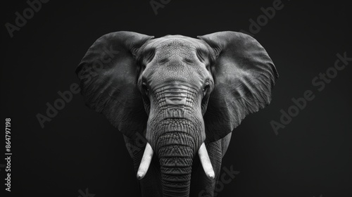 Elephant head with fine details, monochrome, black background, high contrast, elegant and powerful