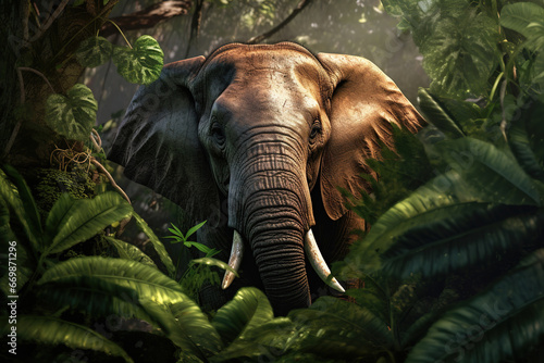 Elephant hiding in the jungle foliage. Photorealistic generative art