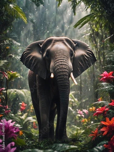 elephant in the middle of jungle, flower field, elephant portrait , fantasy photography
