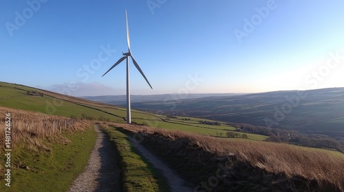 wind, turbine, hill, landscape, vale, grass, meadow, nature, outdoors, mountain, green, blue, sky, light, sun, view, horizon, path, road, energy, renewable, power, clean, technology, sustainable, environment, rural, farmland, elevation, perspective, distant, shadow, blade, metal, structure, scenic, electricity, farm, agriculture, windmill