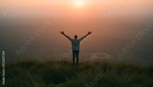 Embracing the Horizon: A lone figure stands atop a grassy hill, arms outstretched toward the warm embrace of a sunrise, embodying freedom, self-discovery, and the pursuit of inner peace.