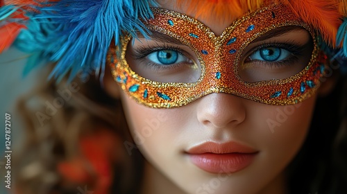 Embracing the Mardi Gras concept with this expressive image. A young lady wearing a mask embellished with colorful feathers symbolizes the spirited concept of Mardi Gras celebrations.