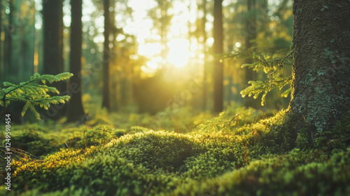 Embracing the warmth of golden light in a serene, moss-covered forest