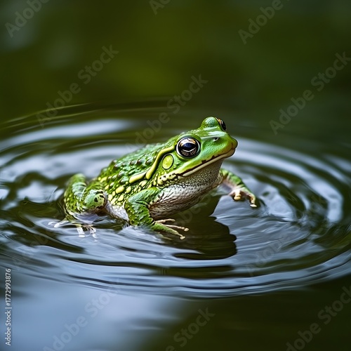 Emerald frog sits in dark water creating concentric ripples Photo