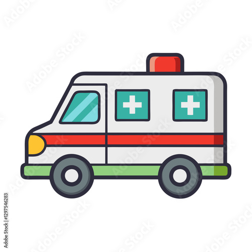 Emergency Medical Ambulance Vector Illustration, A colorful vector illustration of an emergency medical ambulance with flashing lights and a red cross symbol, used for healthcare and rescue.