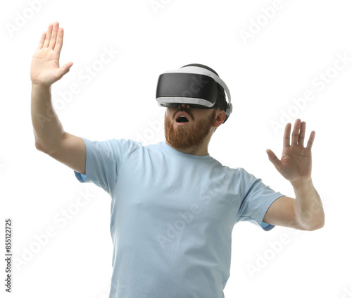 Emotional man using virtual reality headset on white background