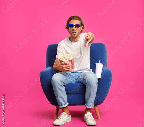 Emotional man with 3D glasses, popcorn and beverage sitting in armchair during cinema show on color background