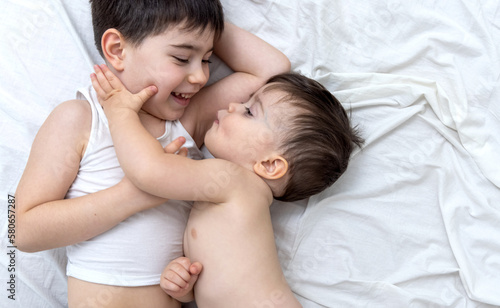 emotional photo with two brothers lying on bed hugging kiss each other cuddling and caresses.big brother kissing little one.different face expression emotion kids child baby boy maternity concept top