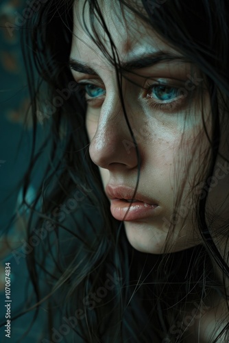 girl, sad, portrait, wet, hair, expression, looking, down, moody, artistic, blue, eye, melancholy, modern, closeup