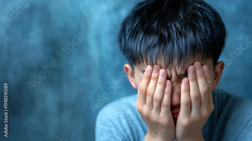 asian, youth, sorrowful, emotion, distress, hand, face, blue, background, feeling, expression, boy, covering, forehead, vulnerability, struggle, isolation, despair, mental, health, anxiety, portrait, solitude, human, loneliness, suffering, stress, reaction, youthful, gesture, close, conveyance, thought, pain, tumult, overwhelmed, dark, emotion, introspection, hopelessness, capture, mood, emotional, state, personal, life events, sentiment