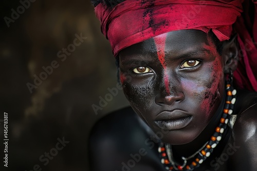 portrait, cultural, identity, youth, body, paint, expression, heritage, tradition, colours, accessory, powerful, deep, gaze, tribal, beauty, strength, humanity, individuality, empowerment, attire, red, black, natural, high-coloured, emotion, essence, creativity, striking, character, background, artistry, soul, representation, uniqueness, custom, culture, connection, visual, storytelling, necklace, adornment, determination