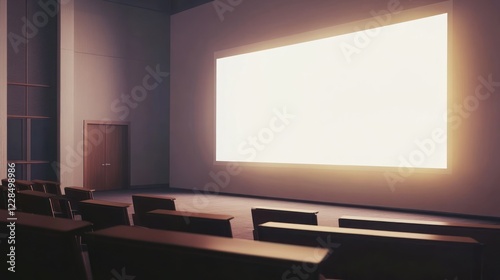 screen, auditorium, empty, seat, large, bright, room, hall, theatre, cinema, presentation, lecture, stage, white, blank, background, interior, building, design, architecture, modern, minimalist, lighting, illuminated, space, dark, wooden, chair, row, conference, meeting, event, venue, indoor, assembly, gathering, show, display