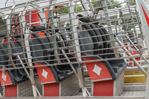 Empty cabin of an old roller-coaster attraction. Close-up. Seats in rows, a system of mounts, a metal grill. Extreme entertainment concept.