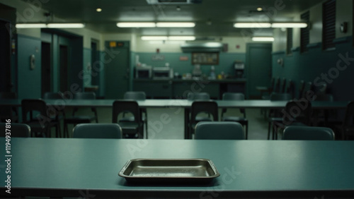 cafeteria, tray, empty, chair, kitchen, dim, lighting, table, perspective, quiet, food, room, solitude, metal, atmosphere, interior, school, waiting, dusk, shadow, surface, furnishing, space, minimalist, institutional, orderly, facility, hygiene, arrangement, isolation, design, architecture, simplicity, calm, setting, abandoned, cleanliness, anticipation, meal, environment, nursing home