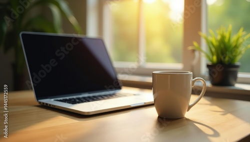 Empty coffee cup, laptop, plant, sunlit window, productivity, isolation