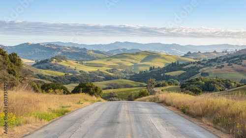 Empty country road stretching into the distance with scenic views of rolling hills and blue sky.