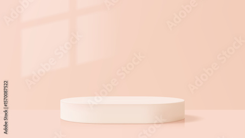 Empty cylinder stage presentation in soft peach room with window shadow display. Pink pedestal stand for product showcase or beauty brand.