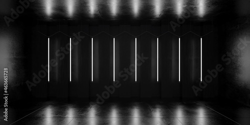 Empty dark futuristic interior stage, product display room. Abstract black background illuminated scene with long vertical neon lights. 3d render.