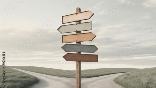 signs, direction, road, crossroad, choice, path, uncertainty, decision, symbol, way, empty, guidance, rural, option, concept, blank, landscape, overcast, metaphor, arrow, countryside, divergence, cleaving, journey, navigation, dilemma, unclear, route, multiple, travel, muted, grass, wooden, pointer, detour, simplicity, faded, lost, doubt