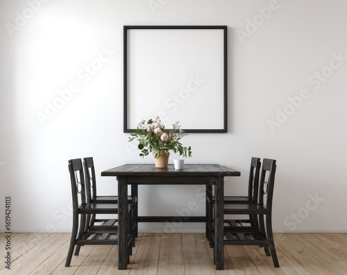 dining, table, chair, frame, wall, empty, white, black, wood, room, interior, modern, rustic, neutral, decor, design, empty space, bouquet, flower, vase, pottery, simple, clean, minimal, light, calm, peaceful, home, furniture, decorating, living, space, contemporary, still, life, image, rendering, three-dimensional, interior design, blank
