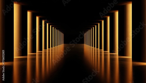 corridor, gold, dark, empty, reflective, column, illuminated, glowing, tunnel, perspective, modern, futuristic, light, space, architecture, design, three-dimensional, render, path, way, future, abstract, symmetry, precision, geometric, interior, hall, long, straight, smooth, polished, floor, empty space, virtual, digital, illumination, sophisticated, golden light, seamless