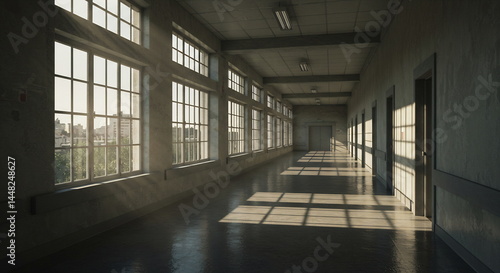 hallway, corridor, empty, sunlight, shadow, window, architecture, building, interior, light, perspective, deserted, urban, concrete, door, eerie, long, floor, wall, sunbeam, grid, window sill