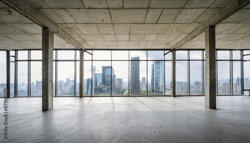 empty modern office interior large windows showcasing city skyline concrete walls floors creating minimalist grunge aesthetic ideal architectural themes