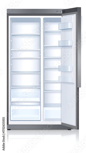 refrigerator, empty, modern, grey, metal, clean, interior, shelf, door, open, cool, fresh, roomy, white, storage, kitchen, appliance, home, design