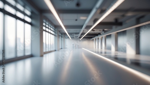 Empty office with windows in blur. Perspective view. Well-lit space. Blurred industrial area.