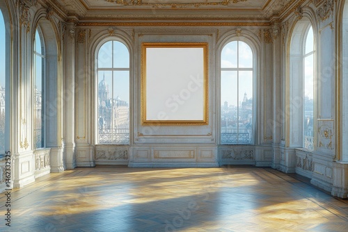 luxury, interior, room, elegant, architecture, blank, frame, art, display, space, empty, gold, ornate, classic, wall, window, view, palace, parquet, floor, light, bright, sky, molding, decoration, historic, style, europa, french, european, city, structure, building, domed, daylight, perspective, indoor, nobody, arched, luxury home, estate, property, gilding, wealth, affluence, grandiose, museum