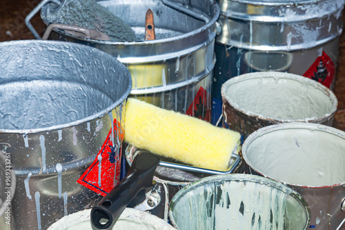 Empty paint buckets containing used rollers and brushes.