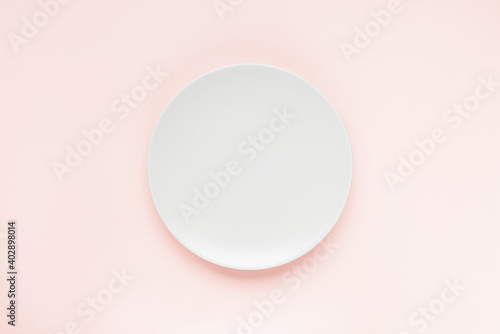 Empty plate on pastel pink minimalistic background. Cooking, meal, dinner, menu and recipe concept. Top view, flat lay, copy space