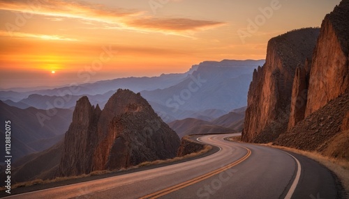Empty road winding through mountainous terrain with tall, rugged cliffs and a soft orange sunset on the horizon