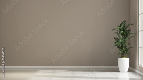room, empty, beige, brown, wall, background, white, window, floor, luxury, modern, sunlight, light, shadow, baseboard, tree, plant, palm, green, corner, elegant, minimal, living, house, home, apartment, interior, design, decoration, architecture, new, renovation, furniture, product, advertising, three-dimensional, space, blank, clean, nobody, copy space