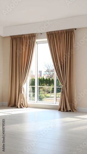 room, window, curtain, beige, light, empty, modern, interior, design, roomy, bright, sunlight, view, garden, tree, neutral, simple, elegant, home, decor, floor, wooden, floorboard, large, calm, peaceful, natural, warm, clean, still, fresh, living, apartment, house