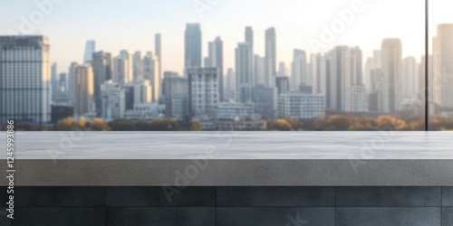 Empty store counter with city skyline background showcasing minimalist design and depth of field for effective text presentation and branding