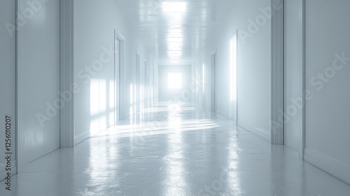 hospital, corridor, hallway, sterile, clean, empty, bright, sunlit, interior, medicals, modern, architecture, design, empty space, light, illuminated, path, perspective, future, building, white, interior design, health care, health, cleanliness, modern building, hospitality, wellness, vacant, office space, sunbeam