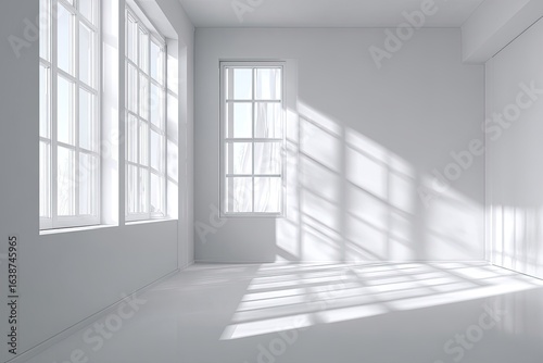 Empty, sunlit white room with large windows