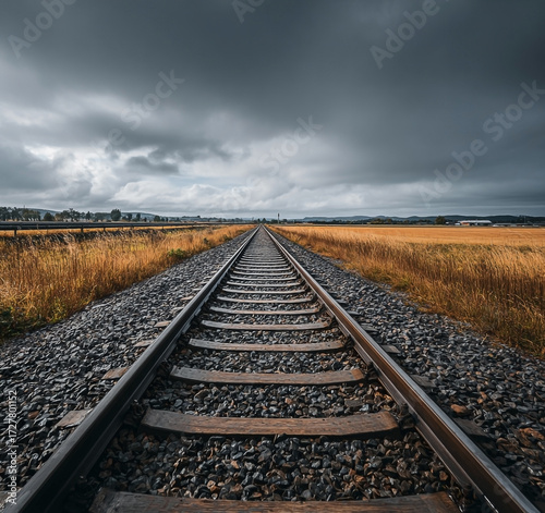 track, railway, train, empty, cloudy, sky, field, rural, gold, grass, gravel, dark, horizon, perspective, metal, brown, nature, journey, endless, path, direction, future, calm, weather, storm, cloud, landscape, autumn, transportation, travel, steel, greyscale, open, space, wide, view, rail, isolated, melancholy, serene, quiet, dramatic