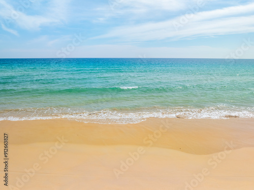 Empty tropical beach and seascape, Beautiful sandy beach and sea in sunny day,Blue sky in good weather day, Beach sea space area nature background