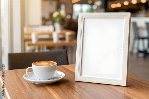 Empty vertical frame mockup on wooden table beside latte art coffee, blurred cafe background, white, display